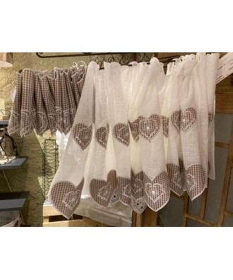 Rideaux par bande de 12.5 cm ou 15cm selon la largeur et l'ondulation désirées. Les hauteurs à choix sont de 15 - 45 - 60 - 120cm. Idéalement, la vente se fait au magasin, mais nous pouvons aussi la traiter par téléphone. La coupe est aisée et ne nécessiste pas d'ourlet. Les motifs vont du classique vichy en passant par l'edelweiss, le coeur ou le cerf.
